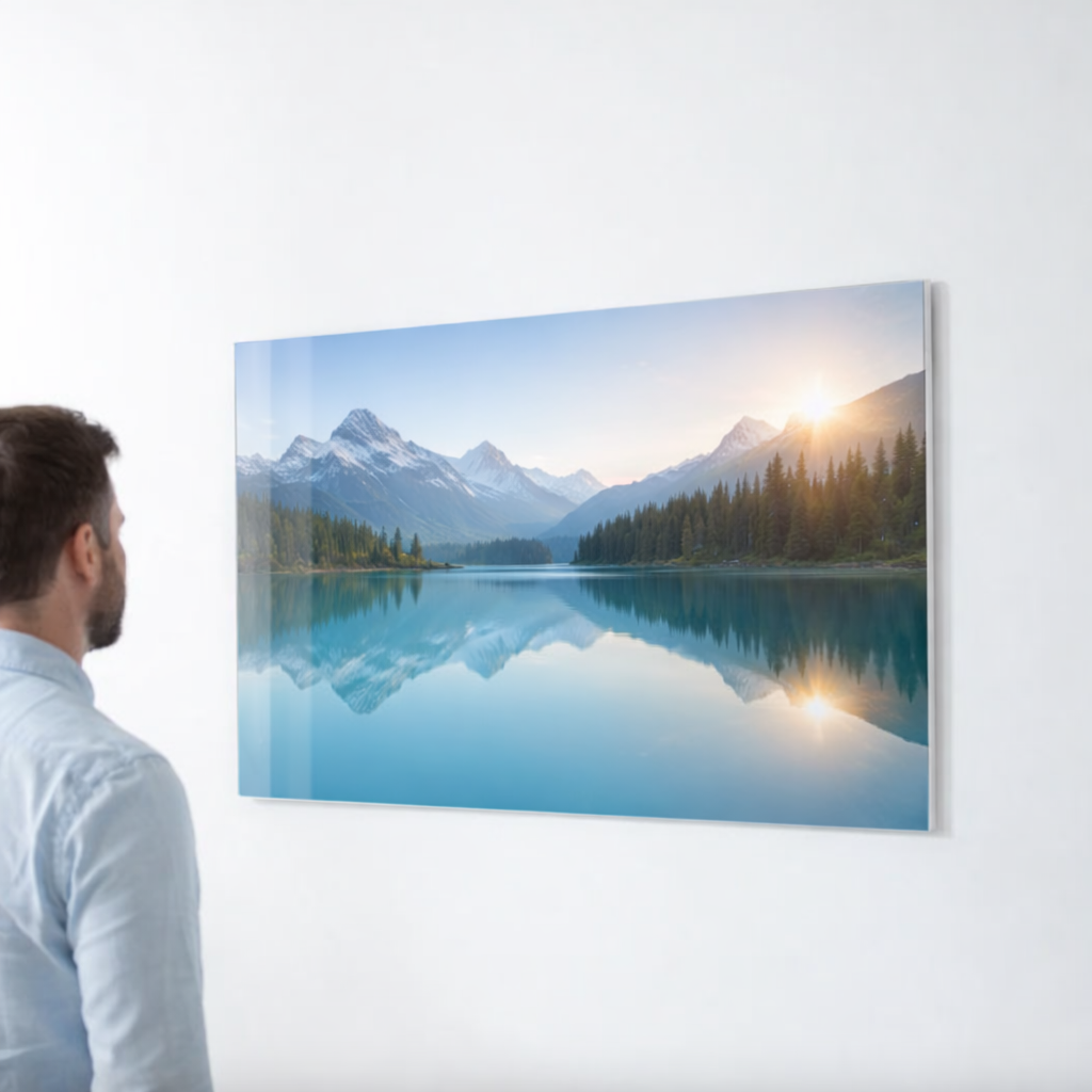 O metacrilato é uma solução contemporânea e de grande impacto visual, onde o brilho do acrílico intensifica cores e contrastes, enquanto a espessura do material cria uma marcante sensação de profundidade. Disponível em formato de painel ou bloco, pode ser aplicado como obra flutuante na parede ou como peça independente em tamanhos específicos. É uma opção sofisticada para quem busca um acabamento moderno, valorizando cada detalhe da imagem.